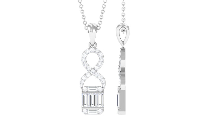 This Moissanite Pendant Necklace is a charming piece of jewelry that will complement your attire effortlessly. Showcasing Baguette and Round Moissanite set in Illusion Setting while dainty Round Moissanite studded on an enchanting infinity design. The Minimalist Necklace is gracefully crafted in Solid Metal to make an extraordinary gift for her. Grab this Simple Necklace for your close one to give as a birthday gift.