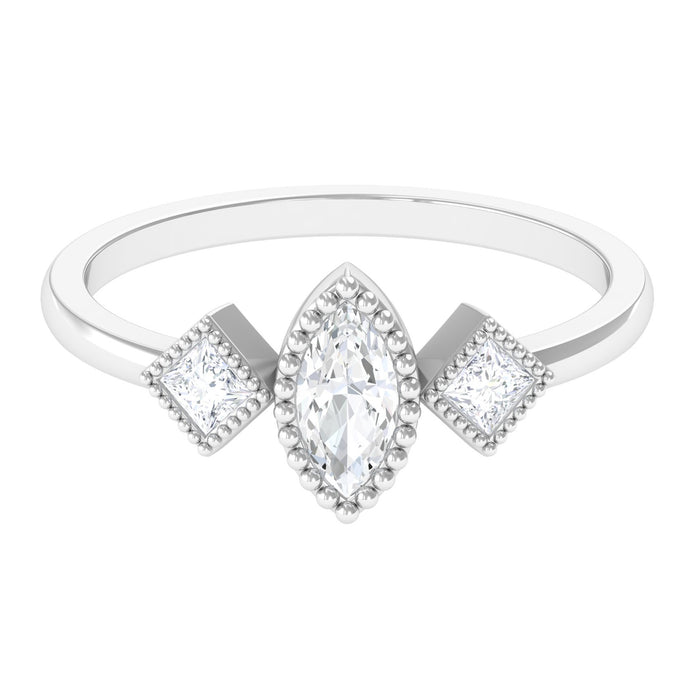 Our Three Stone Engagement Ring features exquisite marquise and princess cut cubic zirconia set in beaded bezel setting, telling the past, present and future tale of your relationship. Adorn her hand with this beautiful CZ Engagement Ring and lets your story shine. Wear this elegant and glamorous Simple Engagement Ring to make an unforgettable impression.