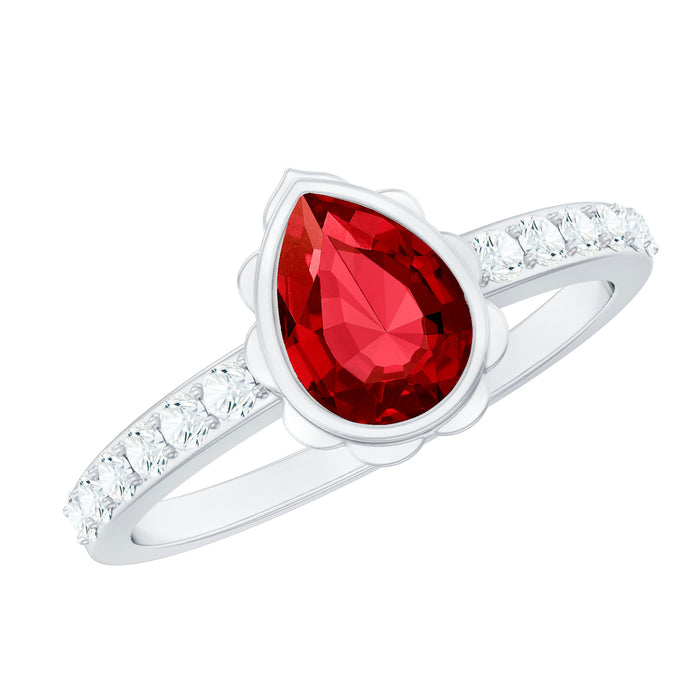 Turn every glance into a moment to remember with this beautiful Lab Created Ruby Engagement Ring. At the center of this elegant design is a 6X8 MM pear shaped ruby, set securely in bezel setting. To add just the right amount of sparkle, the band is decorated with a line of round lab grown diamonds as side stones. Both the stones - AAAA quality lab created ruby and EF-VS quality lab grown diamonds are chosen for their brilliance and clarity, offering the look of luxury with ethical value. The slim and comfortable band makes it ideal for everyday wear while still standing out for special occasions. This Pear Shaped Ruby Ring is designed for someone who loves elegant jewelry with a touch of personality. Crafted with certified lab grown gemstones, it offers both beauty and ethical value. Packed in a premium jewelry box, this Lab Created Ruby and Diamond Engagement Ring is ready to become a lasting reminder of love, commitment, and the beginning of forever. Let this Pear Engagement Ring be the one that starts your journey together.