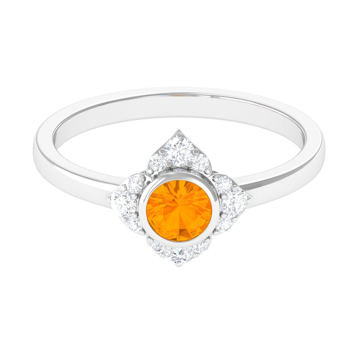 The Perfect Combination of Orange Fire Opal and Diamond in this Flower Engagement Ring is mesmerizing. The Round Natural Fire Opal set in Bezel Setting in the Centre of a Round Diamond Petals. Get this Floral Inspired Engagement Ring for your Blooming Lady Love, this Fire Opal Engagement Ring is a stunning jewelry, which she will cherish her whole life.