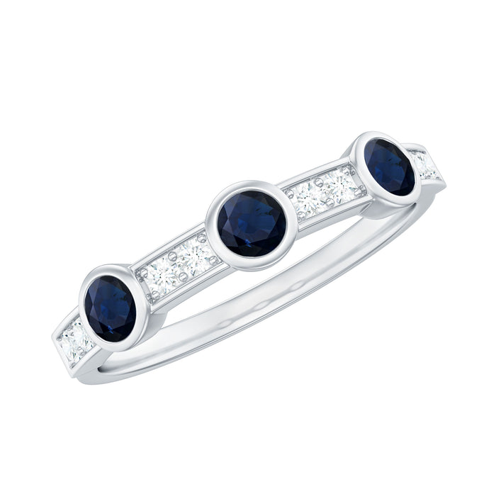 The Round Shape Blue Sapphire in Bezel Setting with Diamond on Half Eternity Band Ring is a perfect piece to stack with your wedding bands.