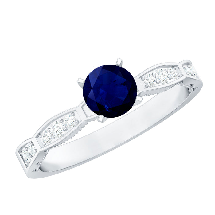 Embark on a journey of everlasting love with this Solitaire Engagement Ring. Embellished with Round Shape Blue Sapphire gemstone set as a center stone with sparkling Diamond Side Stones and Beaded Detailing.
