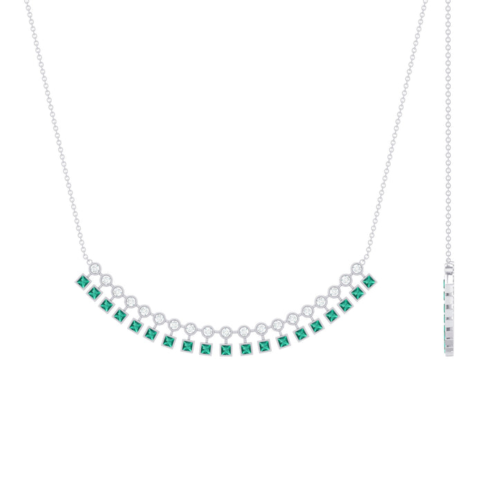 Modern glamour meets classic bridal style in this Curved Bar Necklace, a piece that feels bold, graceful, and full of sparkle. The design features a gentle curved bar that sits beautifully along the neckline, creating a flattering and elegant look that works perfectly for weddings, cocktail events, and special celebrations. Two neat rows of gemstones give this necklace its standout appeal. One row showcases princess cut lab grown emeralds. The second row is lined with round cut moissanite stones, adding bright shine and contrast. Each stone is set in a smooth bezel setting, which keeps the look timeless while also holding the gemstones securely in place. The mix of square emeralds and round moissanite creates a striking pattern that feels eye-catching without being overwhelming. The curved bar shape allows the Emerald and Moissanite Necklace to sit comfortably and naturally, making it easy to wear for long hours. It also layers beautifully with another necklace if you enjoy a stacked necklace look. Perfect as a bridal necklace, wedding jewelry, or a statement piece for evening wear, this design adds a touch of luxury to any outfit. Crafted in high-quality metal, it is available in various metal options to suit different styles and preferences. The Lab Grown Emerald Necklace arrives in a jewelry box and includes a certificate of authenticity for added confidence and peace of mind.
