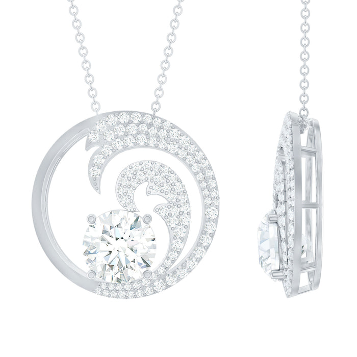 Inspired by the Tranquil waves this Moissanite Designer Pendant is precisely crafted with 14K White Gold Plated Silver. It features an 8 MM Round Shape Moissanite securely placed in Prong Setting and adorned with the stone studded wave metallic motif. This Circle Pendant bears a classic shine of D-VS1 quality Moissanite which makes it the perfect option to complete your look. This pendant will dangle with a sturdy cable chain which makes it perfectly sit on the neckline making you look dazzling. This pendant can be presented as a gift for your special one and make the moment memorable forever.