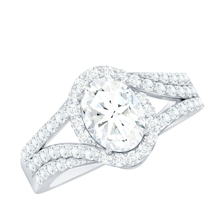 This engagement ring features an oval lab grown diamond secured within a structured setting and complemented by a split shank band. The design focuses on symmetry, enhanced brilliance, and a balanced silhouette suitable for long-term wear.