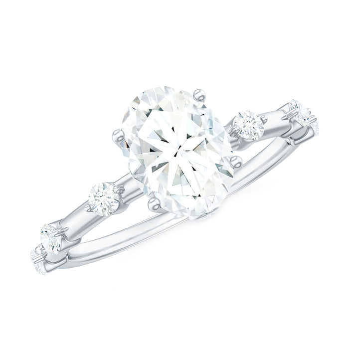 As you present this sparkling Moissanite Ring to your beloved, watch the tears of joy stream down her face. The 6X8 MM Oval Shape Moissanite, set in Prong Setting with spaced accents on both sides of the shank, creates a beautiful and gleaming engagement ring. This Oval Solitaire Engagement Ring is sure to make a stunning addition to her collection and add a touch of brilliance to her outfit. With a total weight of 1.75 Carats and a high quality of D Color and VS1 Clarity, this ring is the perfect symbol of your love and devotion. All the gemstones are certified and thoroughly checked for quality.
