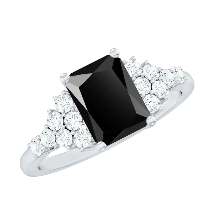 A classic mix of dark and bright defines this striking Black Onyx Engagement Ring, crafted to leave a lasting impression. At the center, a 6X8 MM emerald cut Black Onyx gemstone takes the spotlight, set in secure prong setting. Enhancing the center stone are carefully arranged round cut real diamonds placed in a cluster on both sides. The contrast between the deep black center and the white sparkle makes this Onyx and Diamond Engagement Ring a true statement piece. Whether you are dressing up for an evening event, attending a celebration, or simply want to elevate your everyday look, this Emerald Cut Engagement Ring delivers the drama. Its bold design makes it an ideal cocktail ring, perfect for women who enjoy pieces that stand out. With AAA quality Black Onyx and HI-SI quality real diamonds, the Monochrome Ring is not only beautiful but also finely crafted with lasting quality in mind. The strong presence of the onyx paired with the soft sparkle of diamonds makes this piece a unique addition to any jewelry collection. If you are searching for a statement ring that reflects confidence, elegance, and timeless charm, this black and white design is sure to be your next favorite accessory.