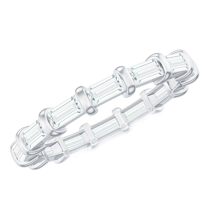 Minimal design and maximum sparkle. This Baguette Eternity Band embodies modern sophistication and timeless meaning. It showcases a beautiful line of 2X4 MM baguette cut moissanite stones arranged in an east west style and secured with bar setting. This Full Eternity Band adds striking brilliance to a minimalist aesthetic. The complete circle design represents everlasting love. With D color and VS1 clarity, the moissanite stones shine with remarkable brilliance, making this Moissanite Stackable Ring a perfect option for anniversaries, special occasions, or simply as a fashionable expression of self-love. Whether worn alone for a modern appearance or stacked with your favorite engagement ring or bands, this Moissanite Wedding Band suits every occasion and mood. Made with precision and accompanied by a gemstone certificate of authenticity, it is elegantly packaged in a signature jewelry box, ideal for gifting or keeping for yourself. Whether you are marking a wedding, anniversary, or significant moment in your life, this Baguette Wedding Band is more than just jewelry, it is a representation of something unforgettable.
