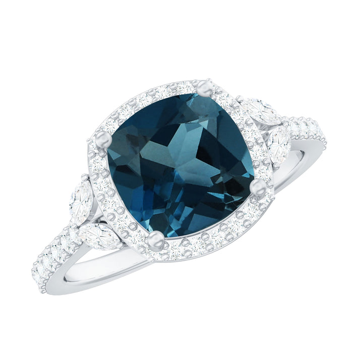 Transform fleeting moments into cherished memories with this luminous London Blue Topaz Engagement Ring, radiating the essence of love. At its heart lies a breathtaking 8 MM cushion cut london blue topaz, securely held in a claw setting. Encircling the blue topaz is a dazzling diamond halo, complemented by meticulously arranged marquise and round diamond as side stones, enhancing the designs brilliance and creating a mesmerizing interplay of fire and sparkle. The ring has an elegant craftsmanship renders it a timeless selection for commemorating life’s most significant moments. Whether intended for a proposal, anniversary, or special event, this Halo Engagement Ring serves as a stunning emblem of enduring love. Meticulously crafted with precision and care, this Blue Topaz and Diamond Ring merges beauty with resilience, making it ideal for daily wear. Each gemstone is certified for quality and authenticity, guaranteeing that you receive a piece of enduring brilliance. Presented in a signature jewelry box, this Cushion Cut Engagement Ring is ready to be gifted and cherished for a lifetime.