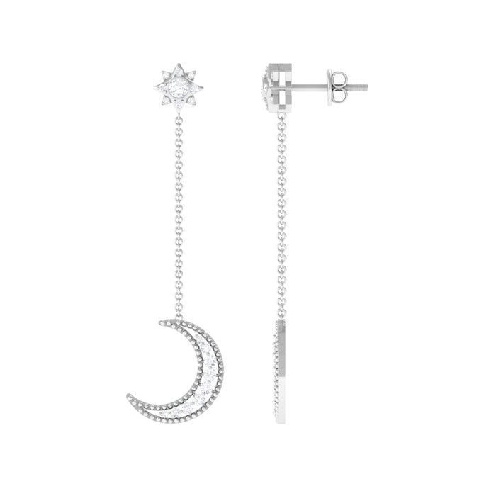 A powerful nod of Diamond Chain Earrings is a great addition to the jewelry collection. A beautiful combination of Crescent Moon Earrings, showcasing the deep meaning and enchanting symbols, represents a powerful dream and personal growth. The moon represents femininity and the star represents aspiration. These Dangling Earrings are adorned with a Star frame, which is adorned with Round Shape Diamond glistening from it. Dangling through a chain is the Crescent moon, decorated with Round brilliant cut Diamond and Round beaded details just to give a stunning visual impact. Embodying beauty and romance, these Chain Dangle Earrings are designed with symbols that can be appealing to different styles. These unique Earrings have a dainty chain highlighting the innocence and purity, illuminating the sky and have the celestial symbolism of direction and effortless elegance. The understated beauty of these Chain Drop Earrings have understated beauty and is a constant ideal of nature.