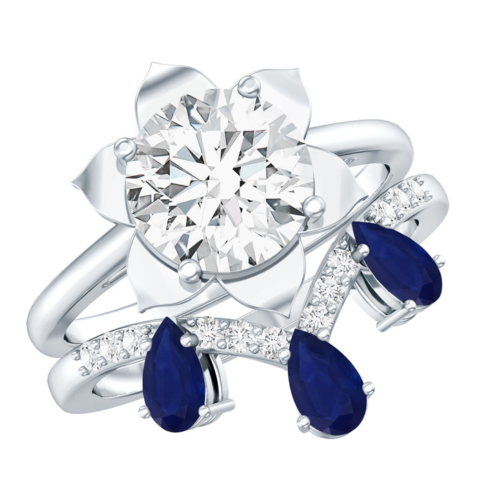 Inspired by natures beauty, this Diamond Flower Ring Set is a breathtaking reflection of love, growth, and timeless elegance. The engagement ring is embellished with an 8 MM round shaped synthetic diamond set in prong setting, where sculpted metal petals embrace the center stone. Complementing the Solitaire Ring is a gracefully curved wedding band adorned with shimmering round cut diamonds and pear-shaped blue sapphire. This Diamond Bridal Ring Set is perfect for nature lovers, you can wear it separately for an understated yet elegant look or stack it with the band for a layered style. Meticulously created by Rosec Jewels, this Engagement Wedding Ring Set blends modern innovation with classic beauty, ensuring a unique and ethically sourced symbol of your everlasting love.