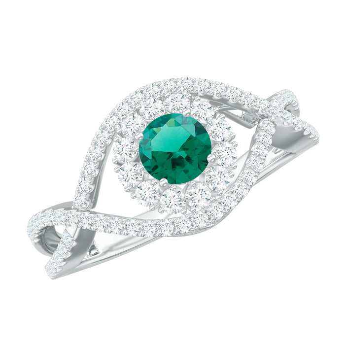 Whispers of elegance meet bold design in this Halo Engagement Ring, that features a mesmerizing 4 mm Round Shape Lab Created Emerald held in Prong Setting, known for its deep green hue. Surrounding the AAAA Quality Lab Emerald is a Halo of sparkling Diamond stones that reflects light in a subtle yet striking way, creating a stunning contrast of color and light. What truly sets this Lab Grown Emerald Ring apart is the graceful Crossover Shank, designed to intertwine like two paths merging into one. The delicate Diamond stones studded along the shank add an extra layer of refinement, catching light from every angle and offering a gentle sparkle. This Crossover Ring is a tale of connection, elegance, and timeless beauty. Perfect for those who crave something that feels both modern and classic, this Lab Emerald Diamond Engagement Ring stands apart from ordinary styles. Whether given as an engagement ring or a meaningful gift, this Lab Created Emerald Ring is destined to become a cherished keepsake, growing in beauty and sentiment with every passing year.