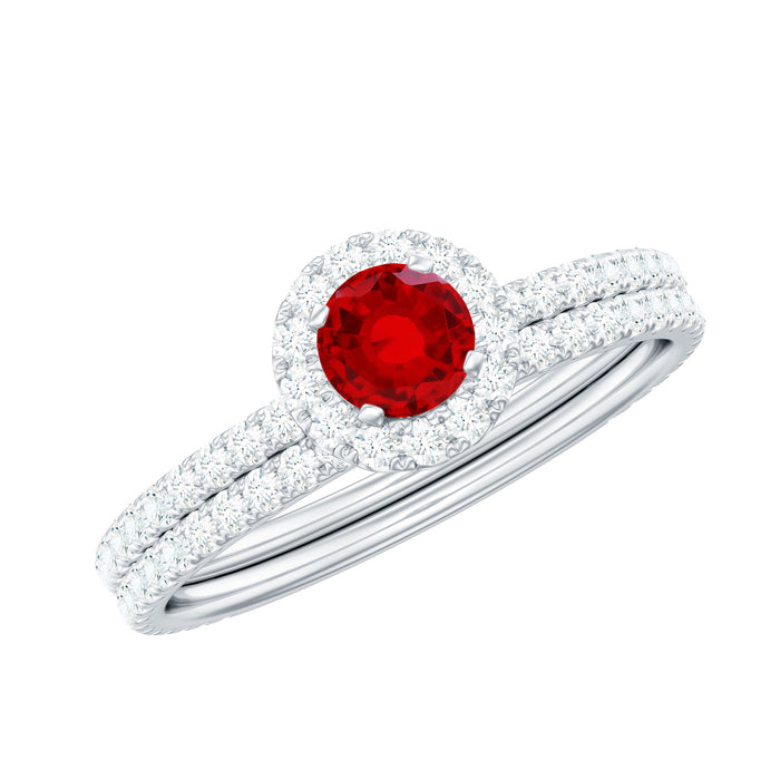 Celebrate your love with a beautifully matched Ruby Wedding Ring Set that brings charm and elegance to every moment. This 2 piece wedding ring set includes an eye-catching engagement ring and a perfectly stackable wedding band, designed to sit together in harmony. The engagement ring features a 5 MM round lab created ruby at the center, full of rich red color and sparkle. It is held securely in prong setting and surrounded by a halo of shimmering moissanite stones, adding brightness and depth. More tiny moissanites continue down the sides of the band, giving the ring a sparkle from every angle. The second ring in the Ruby Bridal Set is a delicate enhancer band, shaped to fit alongside the engagement ring without gaps. It is designed in a half eternity style, with moissanites set across the top half of the band. When worn together, the two rings create a complete and balanced look. This Ruby Engagement Ring Set blends classic charm with a modern touch, making it perfect for someone who loves timeless style but wants something a little different. Whether you wear both rings together or separately, they are made to feel special every day. This Halo Bridal Ring Set arrives in elegant packaging, ready to celebrate your love story.