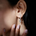 These classic and elegant Moissanite Hoop Earrings are a beautiful blend of timeless style and modern charm. Designed to stand out while remaining graceful, these Cross Drop Earrings feature a hoop adorned with sparkling round shaped moissanite stones. Hanging gently from each hoop is a metal cross, creating a meaningful and stylish drop design. The combination of the shimmering hoop and the simple cross gives these Moissanite Drop Earrings a classic look that feels both fashionable and symbolic. Made with high-quality D-VS1 moissanite, the stones offer exceptional clarity and brilliance, giving the Cross Hoop Earrings a luxurious finish. They are comfortable to wear and suitable for both everyday outfits and special occasions. Their elegant design makes them easy to pair with casual looks, evening wear, or festive attire. Perfect as a birthday gift or a thoughtful surprise, these Religious Earrings are made to be cherished for years. With their lasting sparkle and classic appeal, they are a meaningful accessory that adds beauty, grace, and confidence to any jewelry collection.