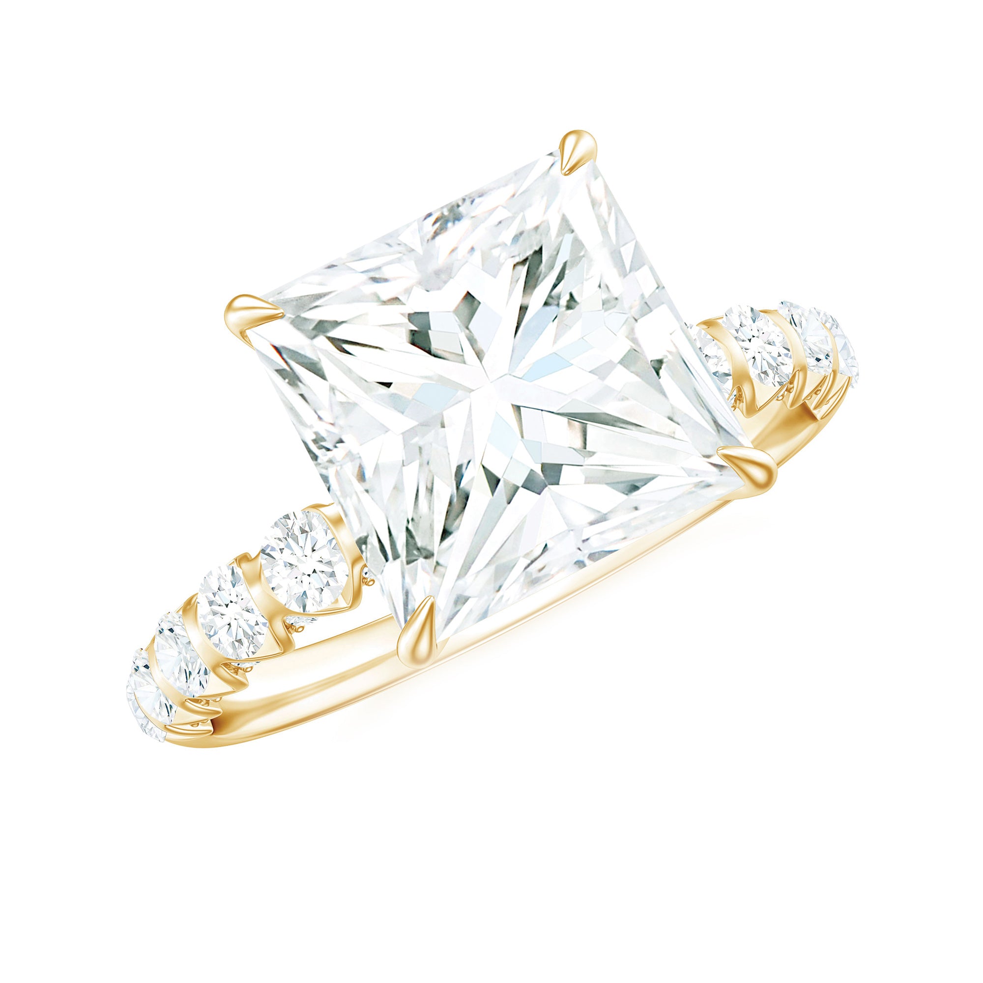 One of the most sought-after shapes in the group of fancy cuts, the Princess Cut appeals to the contemporary aesthetic owing to its modish square shape. A Moissanite Princess Cut Engagement Ring looks like an inverted pyramid when viewed from above. It is prominently prized for its high degree of symmetry and 50-58 diagonal facets that exude phenomenal brilliance (though not as much as that showcased by a round cut).