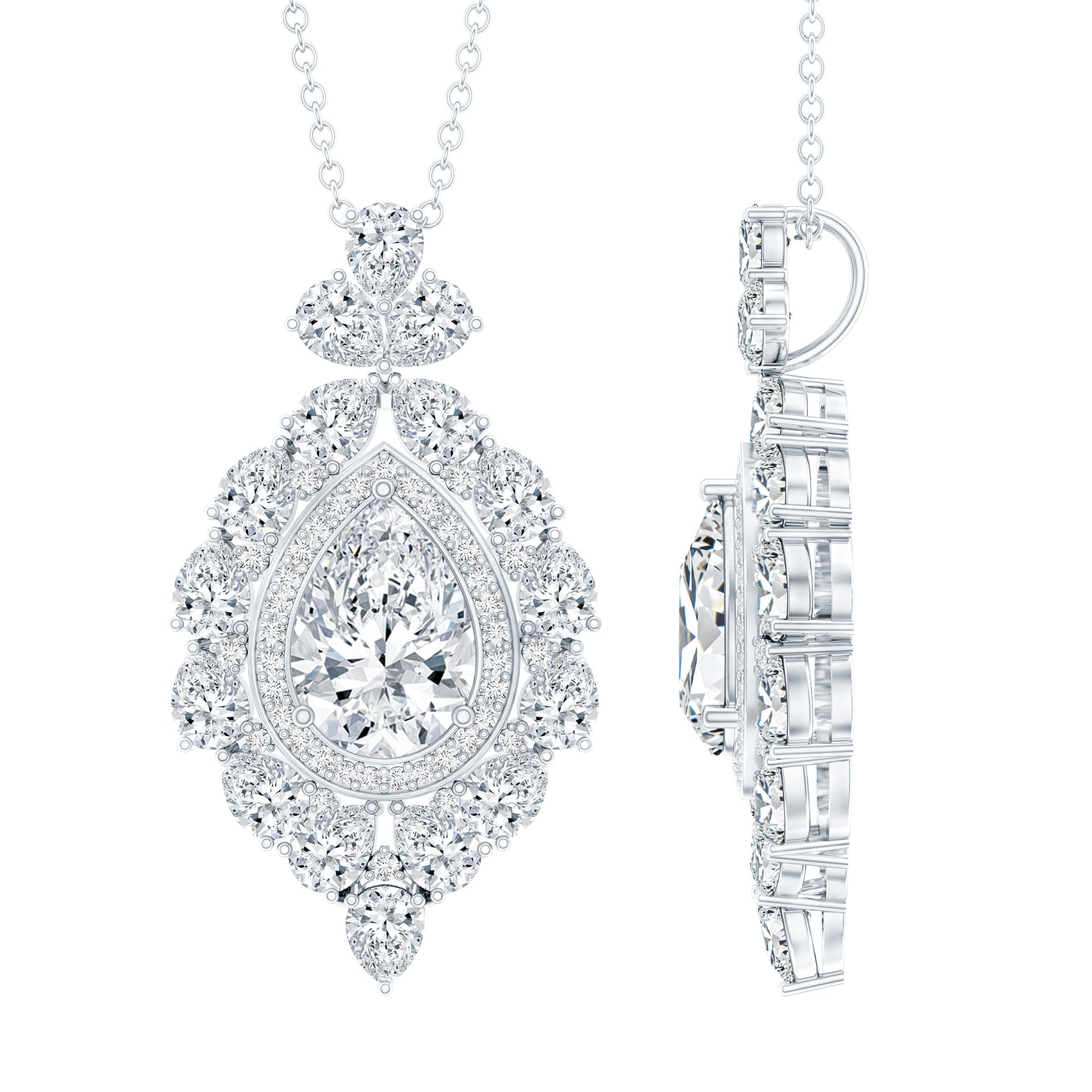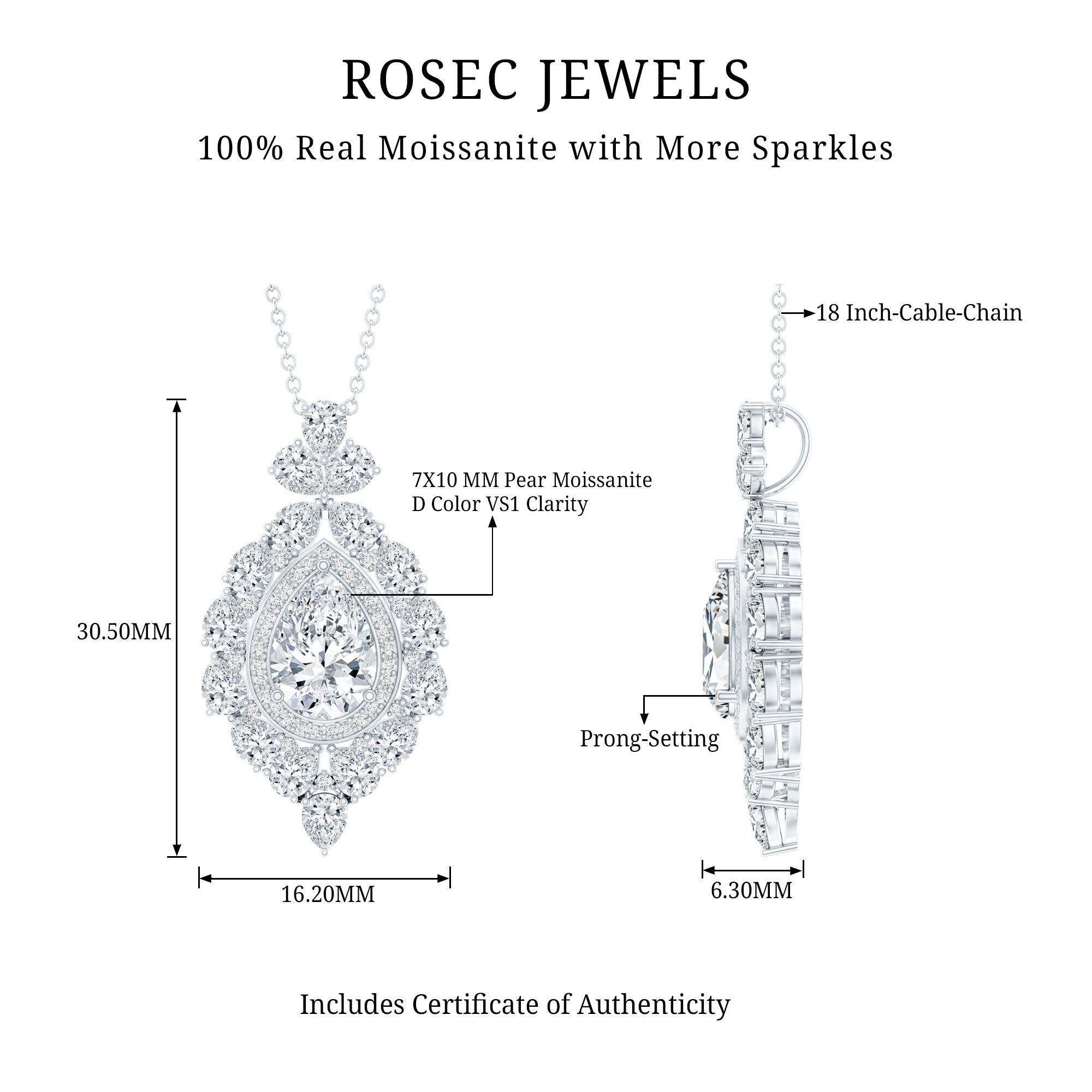 Embrace your bridal look with this Moissanite Pendant, crafted with 14K White Gold Plated Silver. This pendant features a 7X10 MM Pear Shape Moissanite of D-VS1 Quality securely placed in Prong Setting, which is encircled with the double halo of Round and Pear Shaped Moissanite Stones. This Halo Pendant has a hidden bail, dangling from a sturdy cable chain that beautifully decorates the neckline. This Statement pendant can be a great choice to present to your lady love on different occasions, such as birthdays or wedding anniversaries. This Cocktail Pendant Necklace will be delivered to you in premium packaging with a certificate of authenticity.