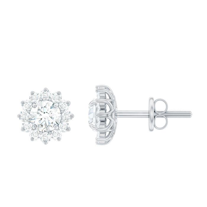 Stunning and Unique Sunburst Stud Earrings embellished with 4 MM Round Cut Moissanite are set in centre in a Claw Setting surrounded with more Round Moissanites in Prong Setting, crafted in a top-notch quality metal. These Halo Stud Earrings are the epitome of grace and capture all the attention with the adorable shine of D-VS 1 Quality Moissanite. The Screw Back Closure of these earrings will keep the earrings on place throughout the time they are adorned. These Nature Inspired Stud Earrings can be a perfect gift for occasions such as birthdays, anniversaries, or any special day. We ensures that the earrings will be delivered to you in a premium quality box with the certificate of gemstone authentication.