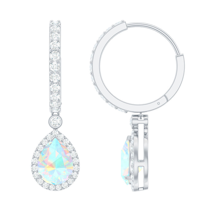 Enhance your party look and captivate everyones attention with these exquisite Classic Hoop Drop Earrings. These earrings feature a stunning 5X7 MM Pear Shape Ethiopian Opal Gemstone as the central drop, encircled by a dazzling Moissanite Halo. To further enhance their brilliance, similar Moissanite gemstones are meticulously studded over the front face of the Hoop Earrings.