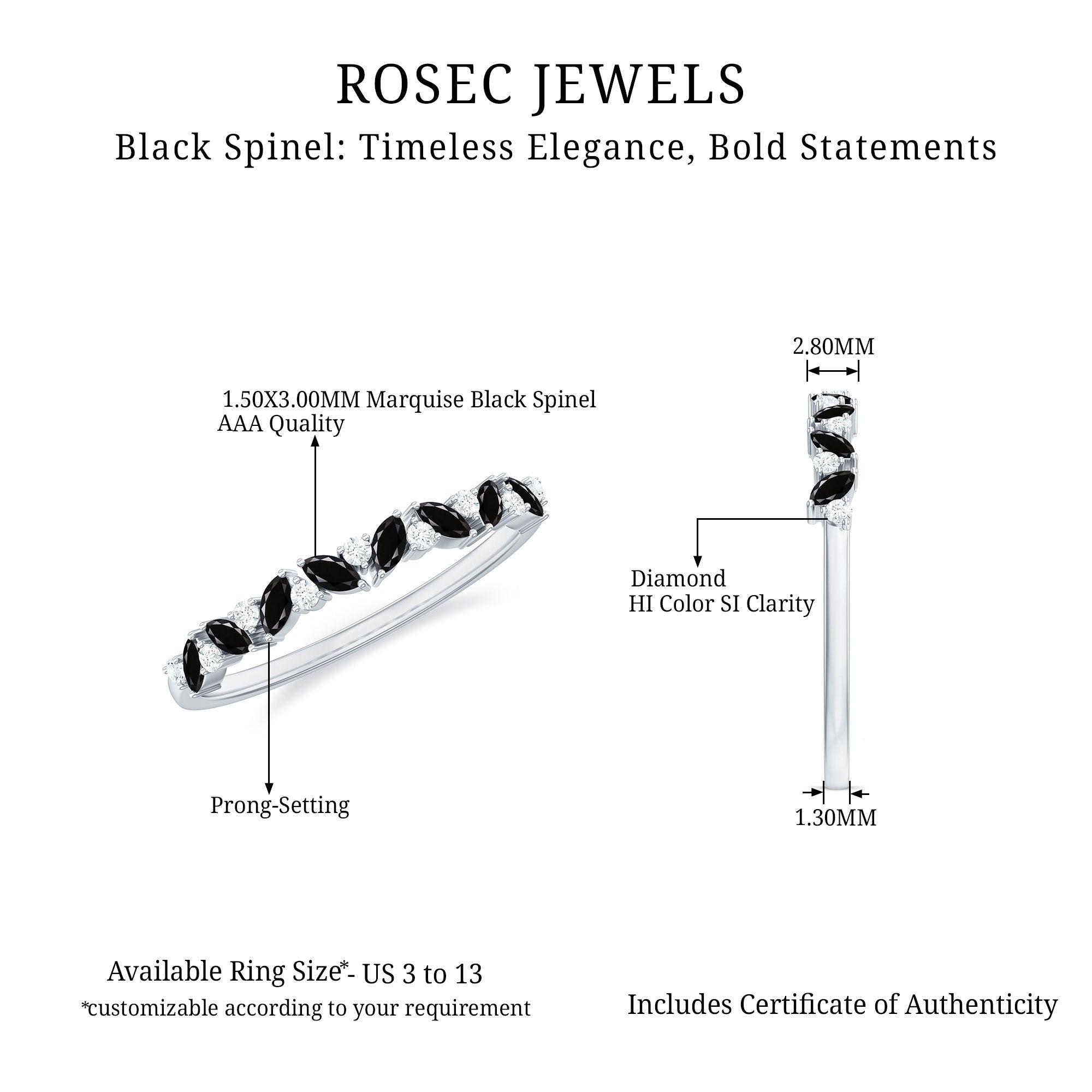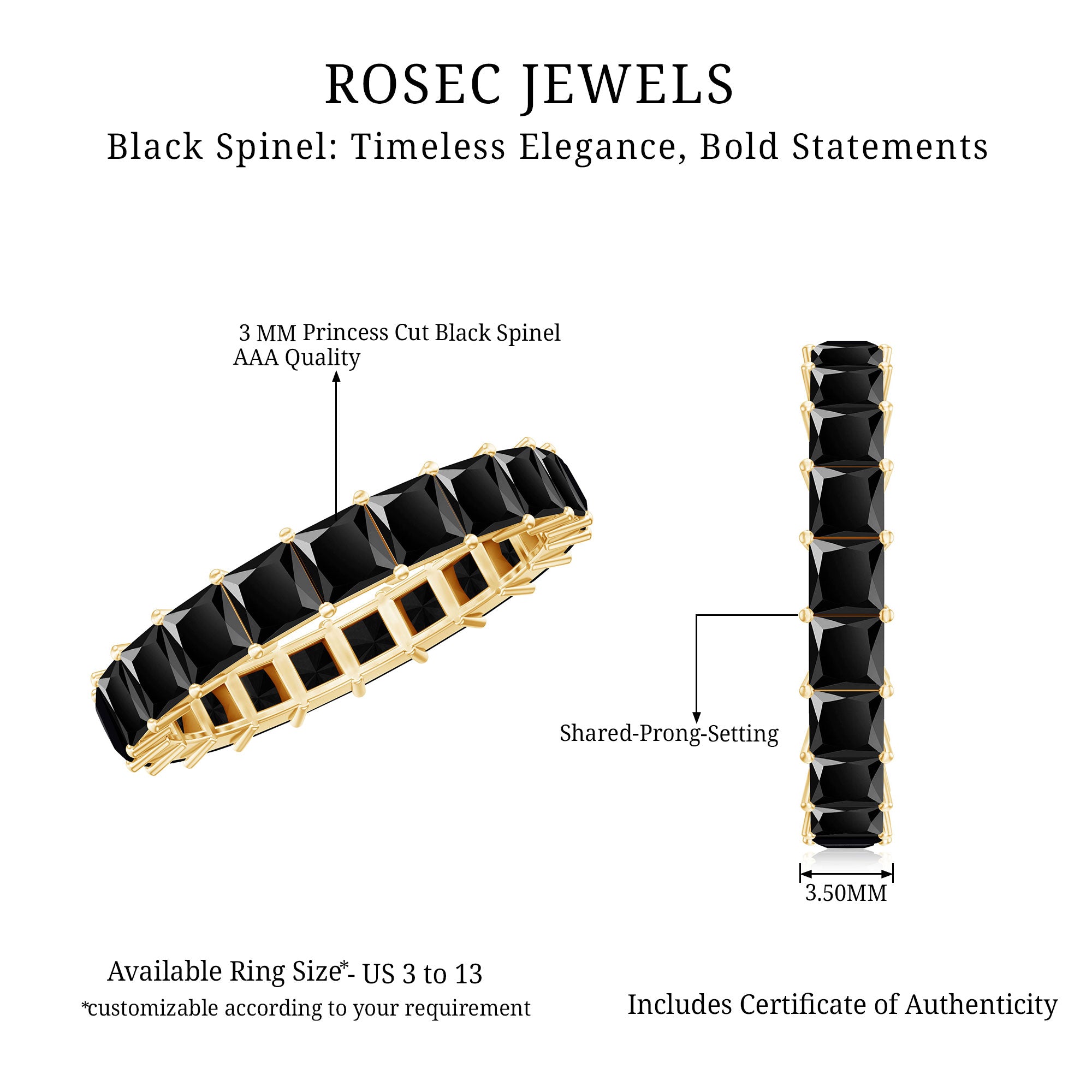 Black Spinel registers a fairly durable hardness rating of 8 out of 10 on Mohs Scale. That makes it highly resistant to regular wear and tear. So be it a Black Spinel Eternity Ring or the one fashioned in the Classic Solitaire Style, you can wear it everyday.