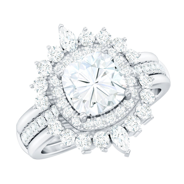 Timeless beauty and vintage charm come together in this breathtaking Moissanite Engagement Ring Set, designed for brides who love a bold yet elegant sparkle. The centerpiece of this set is an 8 MM cushion cut moissanite set in secure prong setting and radiates brilliance and fire, carefully framed in a shimmering halo of round moissanite stones. This delicate halo and side stones enhances the center stone’s sparkle while giving the ring an antique-inspired feel that is both regal and romantic. What makes this piece truly special is the graceful pairing of the engagement ring with a matching curved wedding ring guard. Adorned with round and pear shaped moissanite stones, the curved contour allows it to frame the solitaire ring perfectly from both sides to form a double halo look, boosting its sparkle and giving the entire Vintage Bridal Ring Set the appearance of a stunning trio ring set, without the need for a third band. This set is a tribute to timeless design, where every stone is placed with care and intention. The mix of brilliant sparkle and vintage styling makes it ideal for the bride who values tradition but also wants a touch of uniqueness. Whether you are walking down the aisle or simply celebrating a meaningful milestone, this Engagement Ring with Wedding Band Set makes a powerful statement of love and elegance.
