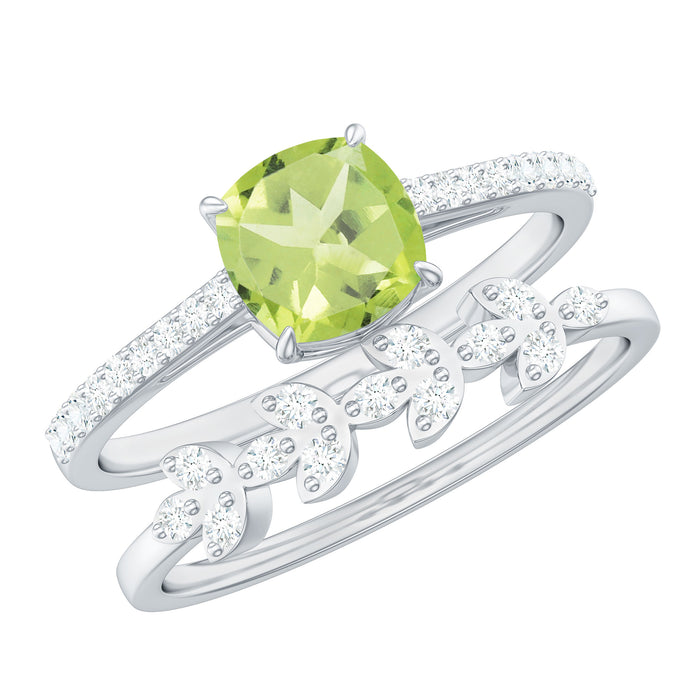 Indulge in the allure of this Cushion Cut Peridot Ring Set, adorned with radiant Diamond, a harmonious fusion of elegance and celestial brilliance.