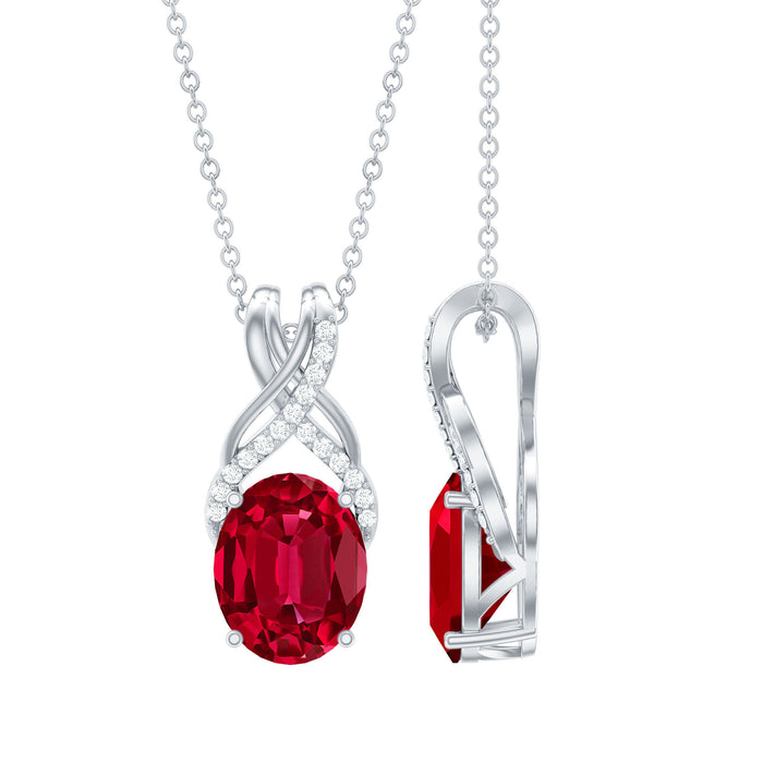 Introducing a one-of-a-kind Created Ruby Pendant Necklace that is both delicate and charming. The 8X10 MM Oval Cut Created Ruby takes center stage in a 4 Prong Setting, with a Twisted Bail adorned with Diamond on a Solitaire Pendant. This Designer Pendant is so beautiful that its likely to become a staple in your collection, one youll never want to take off.