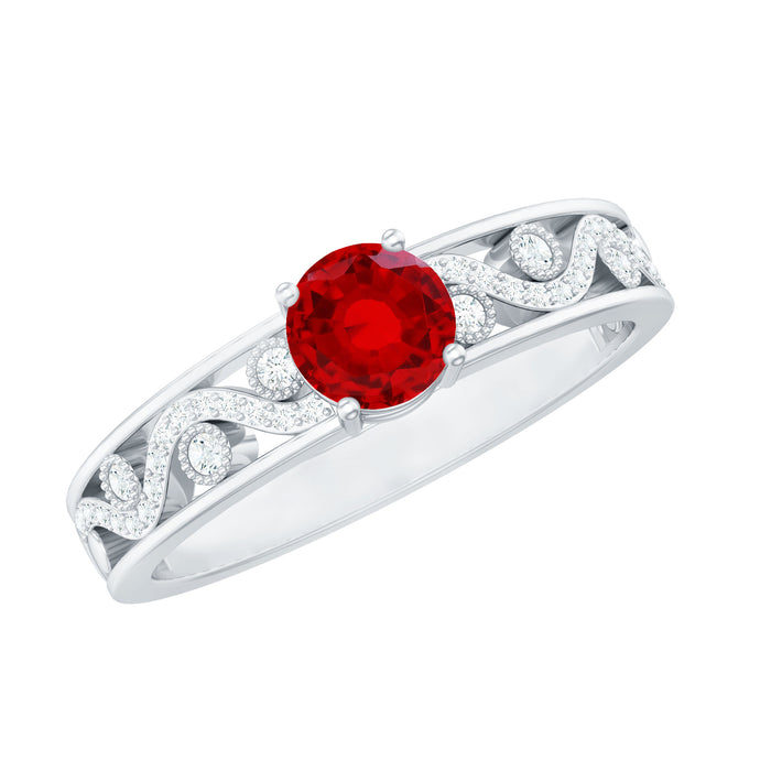 Celebrate your special day with this exquisite Designer Engagement Ring. The centerpiece showcases a stunning Round Shape Created Ruby gemstone, elegantly accented by sparkling Diamond gemstones and Beaded Detailing on the band. This Created Ruby and Diamond Ring is perfect for those who admire the beauty of gemstones and the brilliant sparkle of Diamond stones. With its timeless and sophisticated design, this ring is the perfect choice to symbolize your everlasting love and create cherished memories.