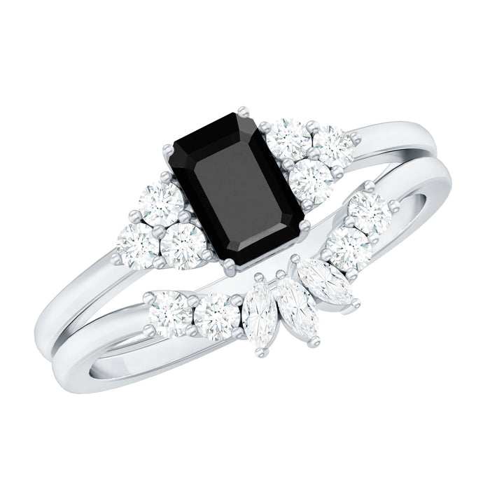 For those who love a mix of modern style and timeless charm, this Black Onyx Bridal Set offers just the right balance. The engagement ring features a 4X6 MM emerald cut black onyx, set in prong setting. The onyx is highlighted by three round diamonds on each side, adding a touch of sparkle. Paired with it is a beautifully curved wedding band, designed to fit snugly around the engagement ring. The band is decorated with a combination of round and marquise cut diamonds, adding an elegant shimmer that complements the center ring perfectly. Whether worn as a complete Emerald Cut Wedding Ring Set or separately, both rings shine with their own unique beauty. The Black Onyx and Diamond Wedding Set is created for comfort and ease of wear while offering a high-end look. Whether you are wearing it every day or saving it for special occasions, this Engagement Ring with Wedding Band Set is made to feel special. The black and white contrast gives it a classic yet striking appeal, perfect for brides who want something different but timeless. Plus, it includes a certificate of authenticity, assuring the quality of both the black onyx and the sparkling diamonds. Thoughtfully crafted and full of meaning, this ring set is a beautiful start to forever.