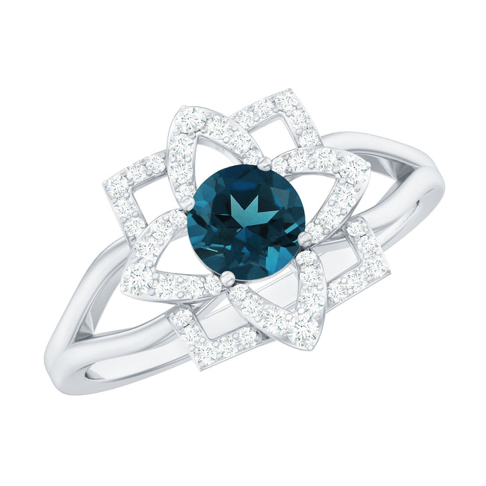This exquisite Blue Topaz Flower Ring represents a distinctive fusion of craftsmanship and brilliance, intended to elevate every occasion. At its core lies a stunning 5 MM round cut London Blue Topaz, securely fastened by a prong setting. Encircling the central stone is a floral halo, artfully designed with small round Diamond stones arranged to resemble delicate petals. This design imparts the Flower Engagement Ring with a sophisticated yet striking character that exudes elegance and freshness. The split shank contributes to an open, airy aesthetic that complements the intricate floral setting. The overall appearance combines modern structure with floral delicacy, making it perfect for those who value exquisite design with a personal touch. Whether selected as an engagement ring or worn as a bold cocktail piece, this London Blue Topaz Engagement Ring effortlessly captures attention. The flower motif introduces a romantic essence, while the split band and meticulous stone arrangement provide a unique, contemporary flair. The AAA quality london blue topaz and HI-SI Diamond stone delivers exceptional brilliance and is recognized for its durability, rendering this Cocktail Ring ideal for both daily wear and special events. It serves as a wonderful means to convey individuality and style through a piece that is both meaningful and beautifully crafted.