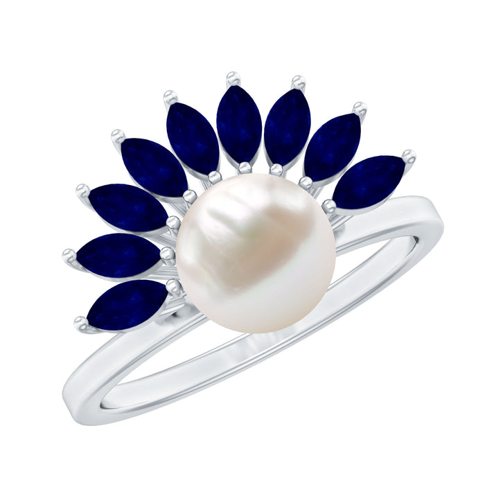 Half Flower Engagement Ring is engraved with Solitaire Fresh Water Pearl in the center with Marquise Shape Blue Sapphire in the prong setting makes lovely floral. This gorgeous accessory for parties and weddings.