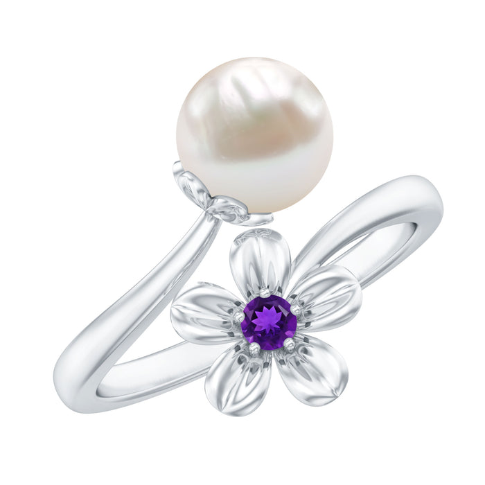 A blooming love, captured in time with this freshwater pearl and amethyst flower toi Et moi ring. This exquisite ring features a 7 MM round freshwater pearl and an amethyst, each nestled in a delicate bead setting. The two gemstones are perfectly matched, their contrasting hues symbolizing the duality of love: passion and purity, strength and tenderness. The flower design of the ring gives the perfect touch of nature and makes it more fashionable.