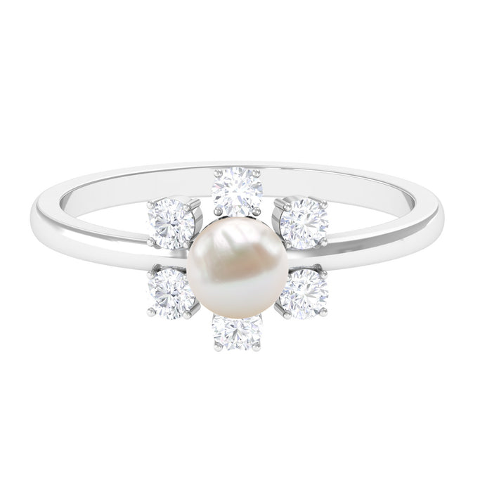 Contemporary Floral design this ring has a unique solitaire White Pearl with shining metal and a sculptural look. Amazingly crafted in Gold with a round shape Freshwater Pearl having Diamond accentuating it. Stunningly adorn yourself with this timeless Freshwater Pearl jewelry.