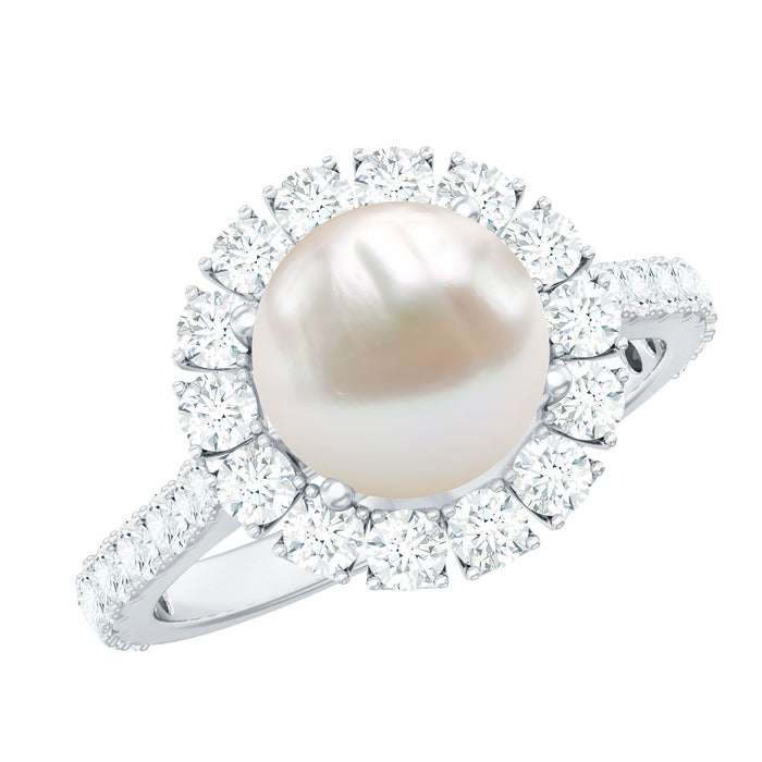 The Glittering Halo of Moissanite is accentuating the Freshwater Pearl in an appealing way. This White Pearl Engagement Ring gives a touch of an aesthetic flower. This Freshwater Pearl Engagement Ring is a piece of fine jewelry, it is a must-buy Pearl Ring.