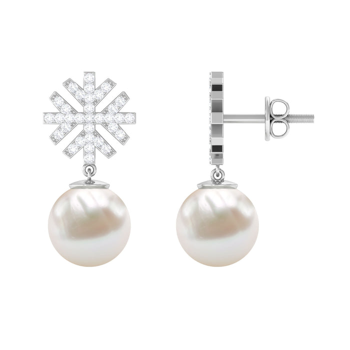 They are a pair of Snowflake Earrings for Women adorned in Solid Gold and feature a Round Shape Freshwater Pearl with Round Shape Diamond stones embellished in Prong Setting. It is also known as Drop Earrings.