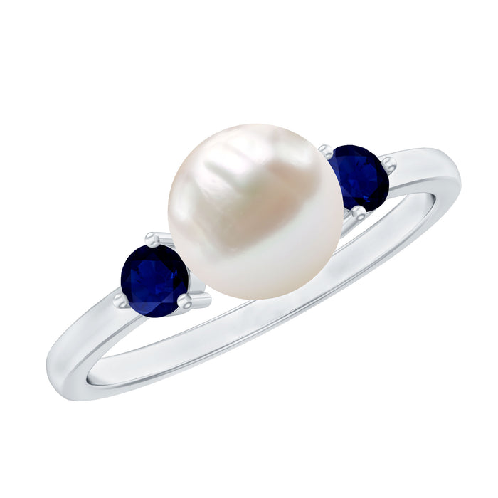 A Forever One Round Cut Freshwater Pearl gem glamorously updates this Solitaire Engagement Ring. Set in gleaming Gold, round cut blue sapphire on both side of the center stone make it a perfect Engagement Ring, brilliantly paving the way to everlasting love. Make her eyes glitter with our new Freshwater Pearl Engagement Ring.