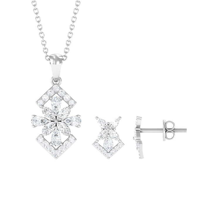 Capture the heart of your beloved and leave her in awe with this elegant Diamond Jewelry Set. The Floral Jewelry Set showcases the timeless beauty of Marquise, Round, and Pear Cut Diamonds, delicately placed in prong setting in a flower style to enhance their charm. This enchanting Art Deco Pendant and Earrings Set is the epitome of fine jewelry, making it the perfect choice for your wedding or any special occasion. The pendant hangs from a fine cable chain that sits gently on the skin, adding a bright accent to the neckline without being too heavy. The coordinating stud earrings feature screw back closures, ensuring the bride has a secure fit from the moment she walks down the aisle to the last dance of the evening. This Diamond Necklace Set combines simplicity with elegance, making it perfect for any bridal style - whether classic, modern, minimalistic, or intricate. Even after the big day, this Bridal Jewelry Set serves as a beautiful keepsake. It can be worn during anniversaries, parties, or special events, always reminding her of the happiness and love. Ideal as a gift or as a final touch to her wedding look, this Diamond Flower Necklace Earring adds beauty, elegance, and a gentle, enduring sparkle.