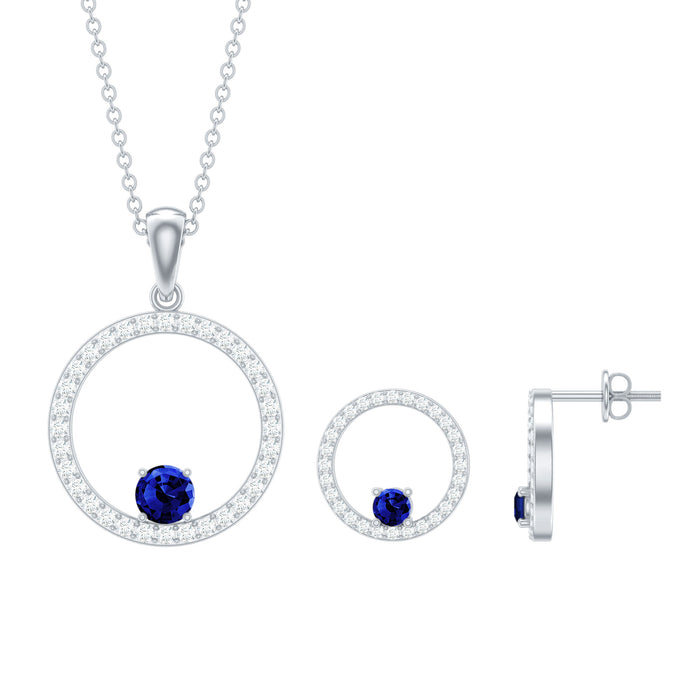 Illuminate your style with our Blue Sapphire Jewelry Set, a delicate piece for you. The pendant features a round cut lab grown blue sapphire stone, elegantly set in prong setting and encircled by an open circle adorned with moissanite stones. Hanging from a sleek cable chain, the pendant rests comfortably and complements both casual and formal attire. The Blue Sapphire Necklace Set is completed with matching stud earrings, each showcasing the same elegant design. The screw back closure ensures they stay secure all day long, providing comfort and confidence with every wear. Their minimalist style allows for easy pairing with other jewelry or wearing them solo. Whether it is your birthday eve or going for a dinner date, flaunt this blue sapphire pendant set every time you get dressed up and make everyone fall for you. Ideal as a birthday present, a thoughtful surprise, or a personal indulgence, it conveys a sense of care that feels truly special. Meticulously crafted with attention to detail and designed for longevity, the Eternity Pendant and Earrings Set combines beauty, simplicity, and timeless elegance.