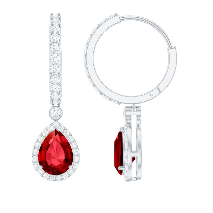 Glistening with charm and sophistication, these Ruby Teardrop Earrings are designed to bring elegance and vibrance to every moment. At the center of each earring rests a 6X8 MM pear shaped lab created ruby, set in prong setting. Surrounding the ruby is a halo of sparkling moissanites, creating a radiant frame that enhances the gemstone’s rich color and gives it a captivating brilliance from every angle. The drop design hangs gracefully from a hoop that is embellished with round moissanite stones, adding an extra layer of sparkle and refinement. The contrast between the bright D-VS1 quality moissanites and the AAAA quality lab grown ruby creates a perfect balance of warmth and light, making these Huggie Hoop Earrings stand out with understated luxury. Crafted with care and precision, the hinged hoop closure ensures a secure and comfortable fit, allowing for easy wear throughout the day or evening. Whether paired with a sleek evening gown or a simple outfit, these Ruby and Moissanite Earrings bring a sense of glamour and grace that never goes unnoticed. Ideal for special occasions or as a cherished gift, they symbolize passion, strength, and confidence. Presented in a beautifully designed jewelry box, these Ruby Drop Earrings are ready to make any moment unforgettable.