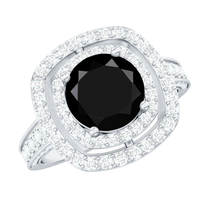 Begin your happily ever after with our Lab Grown Black Diamond Engagement Ring, a ring that reflects intense love. It is embellished with an 8 MM Round Shaped Lab Grown Black Diamond wrapped in a double halo frame of Moissanite which offers a glamorous and dazzling shine. This classic combination of black Diamond and Moissanite offers a captivating visual. This Double Halo Engagement Ring is not just a ring but a perfect blend of elegance and sophistication. Celebrate your special moments by presenting our Black Diamond Ring to your lady love and make them truly memorable.