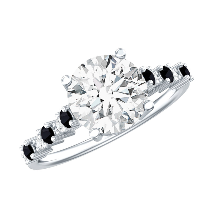 This Solitaire Diamond Engagement Ring completes the moment when love is in the air, it is handcrafted to shine with timeless beauty. At the center of this Solitaire Ring, an 8 MM round shaped lab grown diamond takes the spotlight, held in secure prong setting. Adding to its elegance, the band is encrusted with alternating round black and white diamond side stones, each carefully placed to create a monochrome look that enhances the beauty of the centerpiece. This 2 Carat Diamond Ring for Women comes with a certificate of authenticity and a signature jewelry box so, you can store your ring safely when not in use. With variety of available options in metal color and purity, you can make this Round Engagement Ring truly one-of-a-kind. Add a pinch of glitter to your looks with our handcrafted jewelry with precision and passion.