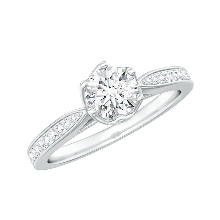 On your special day, embrace timeless elegance with this lab made Diamond Engagement Ring. Handcrafted with perfection, the 5 MM round shaped EF-VS quality diamond gemstone takes center stage and is set in a unique lotus basket setting. The pinched shank is also adorned with smaller round diamonds, this Solitaire Ring is a symbol of everlasting commitment. This Diamond Wedding Ring is an absolute showstopper thatll make your special day unforgettable, and the gemstone will catch everyones eye and leave them wondering where you got such a stunning piece. All of our jewelry comes in the appropriate packaging ensuring they are ready for presenting upon arrival.
