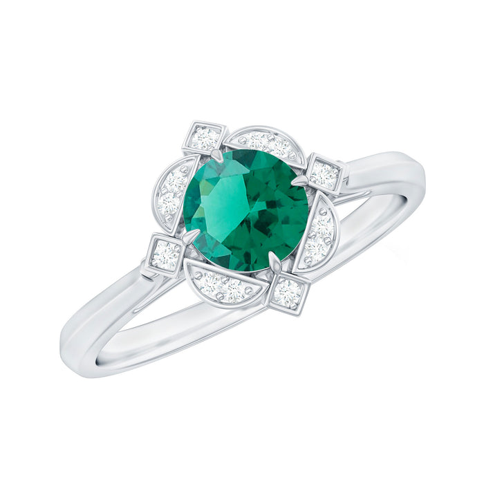 Revive your cherished moments with our elegant Vintage-Style Ring. This stunning piece showcases a 6X6 MM Round Shape lab created emerald at its center, nested in a claw setting. The ring is further enhanced by Diamond accents, giving it a refined and eye-catching appearance. This Ring is crafted in Art Deco Design which makes it a perfect Vintage Engagement Ring. The classic green hue of this Art Deco Ring makes it the center of attraction. The AAAA Quality Emerald and HI-SI Quality Diamond make it the perfect dazzler for the occasion. The ring is the perfect blend of vintage shine and contemporary design. This Green Gemstone Ring is crafted by Rosec Jewels for your special occasion. To ensure that your feelings attached to the rings are secured, we will deliver this Engagement Ring in Premium Quality Packaging.