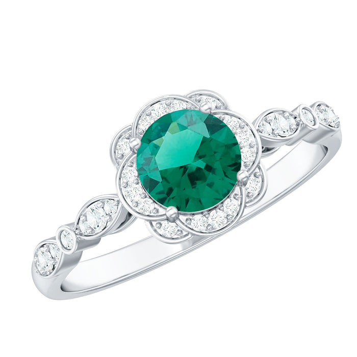 Elevate your special day to new heights with the spellbinding beauty of our Nature Inspired Lab Created Emerald Engagement Ring with Diamonds, a symbol of luxury, love, and your own unique elegance. At the heart of this magnificent creation, a 6x6 mm round shaped emerald takes center stage, cradled by a dazzling array of round diamonds that ignite a symphony of brilliance. The Aaaa Quality Emerald and Ef-Vs Quality Diamonds embody the very essence of luxury and elegance, reflecting your inner radiance. This Emerald Diamond Ring is not just a piece of jewelry; its a testament to your impeccable taste and style. Rosec Jewels, a true artisan of beauty, has taken it upon itself to amplify your allure with its exclusive jewelry pieces, meticulously crafted with lab-created gemstones.
