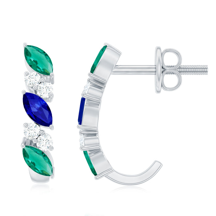 Created blue sapphire and created emerald are prong set in this visually pleasing pair of J hoop earrings. The earrings are set with marquise shape created emerald and marquise shape created blue sapphire, while dazzling round moissanite is held in between the stones to create a charming effect. Secured in prong settings, the gemstones are perfectly faceted and polished for an elevated look. These elegantly designed earrings are secured with hinged hoop findings.