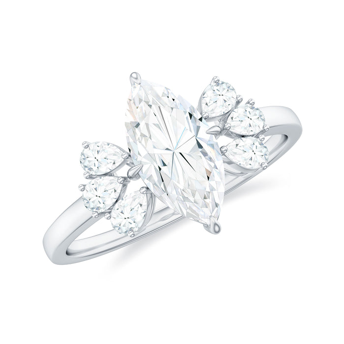 Graceful and captivating, this Moissanite Engagement Ring effortlessly blends timeless charm with a modern, luminous glow. At its center sits a dazzling 5X10 MM marquise cut moissanite, expertly set in prong setting that showcases its elegant, elongated shape. The D-VS1 quality Moissanite symbolizes lasting love and pure devotion. To amplify its sparkle, three pear shaped moissanite stones are thoughtfully arranged on each side of the center stone, creating a harmonious and eye-catching trio design. This cluster of stones enhances the ring’s overall radiance while maintaining a refined simplicity that speaks volumes. Each moissanite in this Marquise Engagement Ring is carefully selected and positioned, offering an ethical and affordable alternative to traditional diamonds without compromising on beauty or brilliance. The smooth, comfortable band complements the striking trio setting, making it perfect for everyday wear with a touch of sophistication.