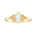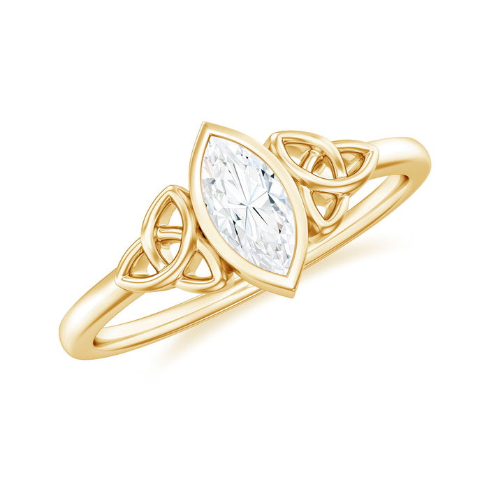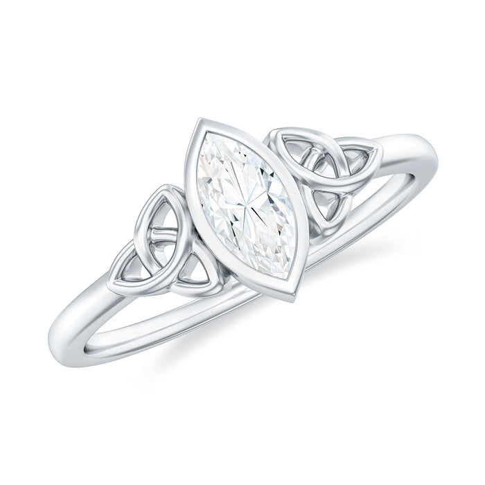 A love as unique as yours deserves a ring that tells a story. This Moissanite Engagement Ring blends timeless symbolism with refined elegance, designed for the one who believes in meaning beyond beauty. At the center, a striking 4X8 MM marquise cut moissanite draws the eye with its elongated shape and pointed ends, symbolizing strength, grace, and a future filled with endless possibilities. Set in a bezel setting, the stone is securely framed while allowing its fire and brilliance to shine effortlessly. What makes this Solitaire Engagement Ring truly special is the intricate trinity knot detailing on either side of the center stone. A symbol rooted in Celtic tradition, each knot stands for life, love, and eternity. Crafted with care and set with a D-VS1 quality moissanite, this Marquise Engagement Ring offers a radiant and ethical alternative to traditional stones, perfect for those who value sustainability without compromising on sparkle. Whether it is the beginning of your forever or a promise to honor the journey you have shared, this Celtic Engagement Ring brings thoughtful meaning to every glance.