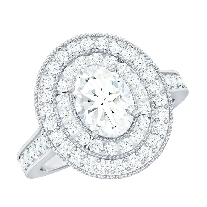 Rediscover the charm of vintage elegance with this gorgeous Moissanite Engagement Ring. Drawing inspiration from classic beauty and old-world allure, this handcrafted piece is perfect for those with a taste for sophistication. At its heart, a stunning 6X8 MM oval cut moissanite shines brilliantly, securely held in prong setting that allows its radiance to dazzle. Encircling the main stone is a stunning double halo of round moissanites and intricate beaded detailing, adding layers of depth, fire, and sparkle, like a radiant frame for your love story. Ideal for anyone who values both history and elegance, this Statement Engagement Ring for Women combines timeless design with contemporary sparkle. Featuring D color and VS1 clarity moissanite stones, you will enjoy all the brilliance and fire you desire while opting for a more sustainable and thoughtful choice over traditional diamonds. Beautifully packaged and offered in various metal options and ring sizes, this Vintage Moissanite Ring is all set to become a cherished part of your forever.