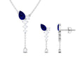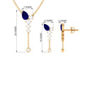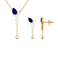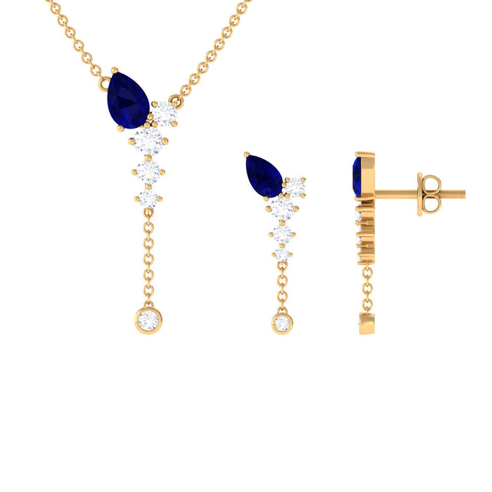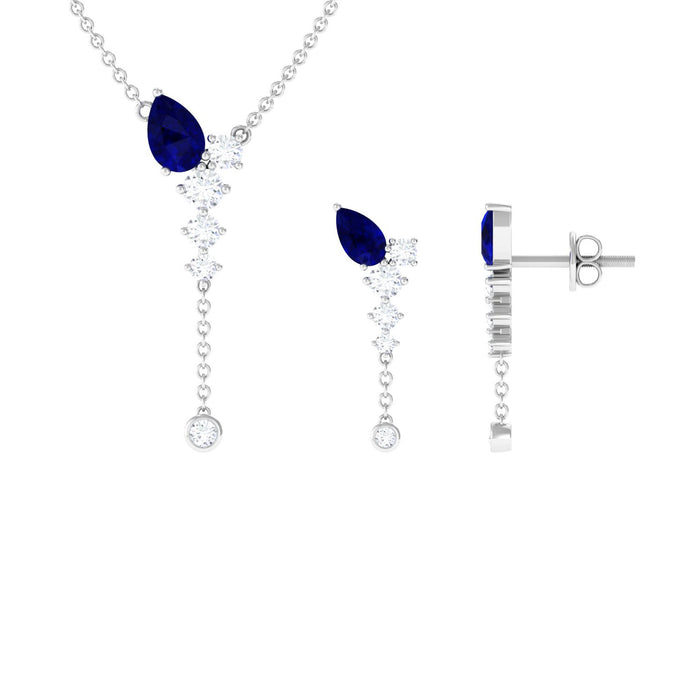 Looking for the perfect minimal jewelry set to elevate your special occasion look? Look no further than this stunning Blue Sapphire Jewelry Set. Featuring a combination of Pear Shape Blue Sapphire and Round Shape Diamond stones, this Y Necklace and Earrings Set is sure to turn heads. The minimalist design of this Dangle Jewelry Set adds a touch of sophistication to any outfit. With a total weight of 2 Carat and AAA quality certification, you can trust that all of the gemstones in this set have undergone rigorous quality checks to ensure their beauty and durability.