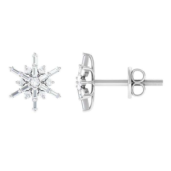 Get ready to shine this holiday season with these Snowflake Stud Earrings. Featuring round and baguette cut diamond gemstones set in prong setting, these Christmas Earrings are bound to catch attention on chilly winter nights. Their brilliant sparkle adds a touch of brightness to your face, making these Diamond Earrings perfect for when you want something that is both subtle and eye-catching. Whether you are heading to a cozy holiday gathering, enjoying a fun winter date, or just looking to add a hint of sparkle to your daily outfit, these Diamond Stud Earrings bring a soft charm to any occasion. Made with care, the Snowflake Earrings are both durable and lightweight, ensuring comfort for all-day wear. The secure screw back closure keeps them firmly in place, so you can go about your day with ease. You can easily pair them with casual outfits or dressier ensembles, as they seamlessly blend in while offering a delicate sparkle every time you wear them.