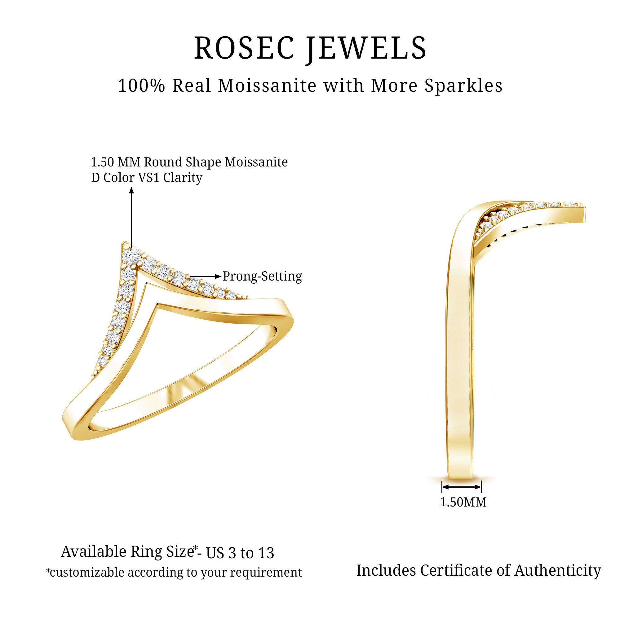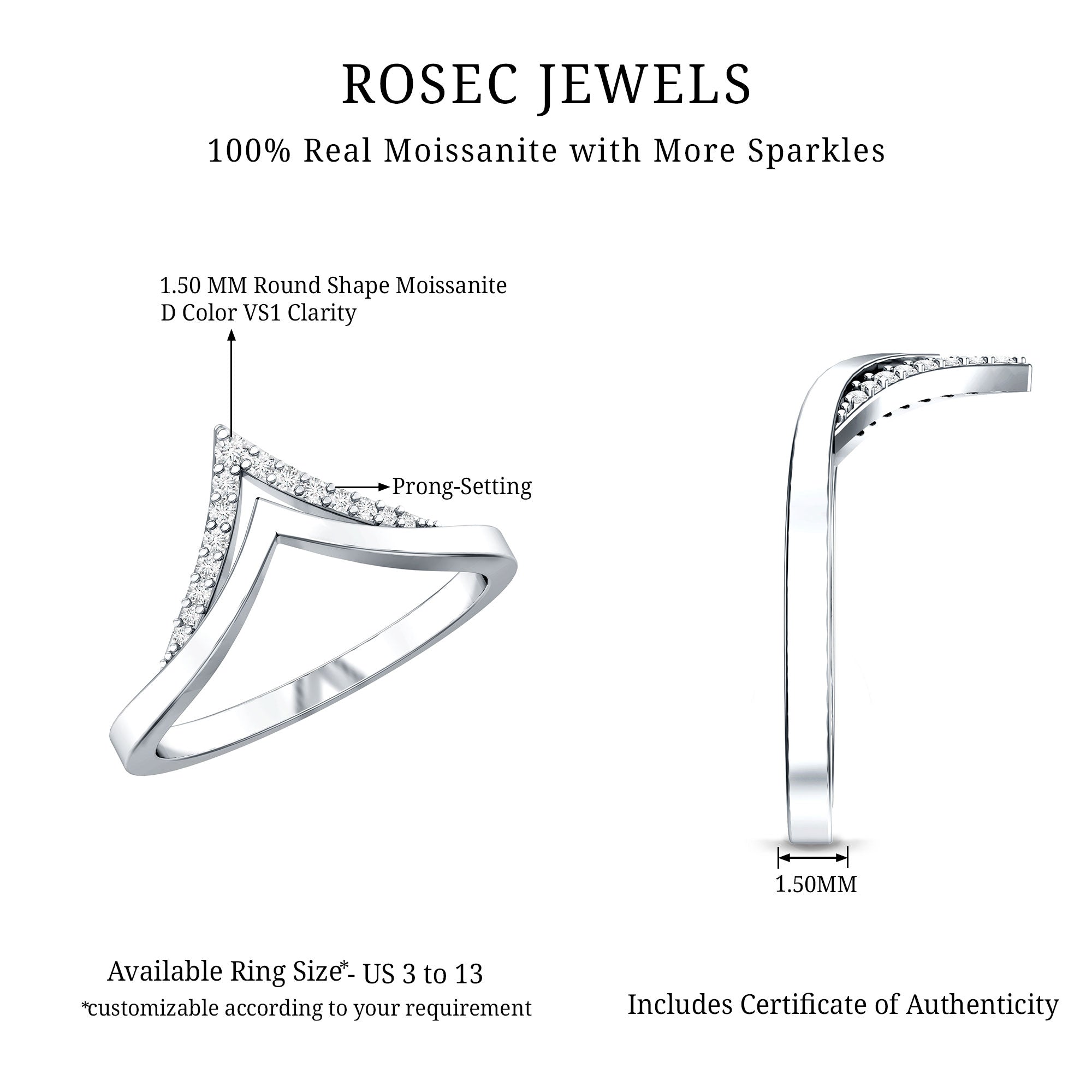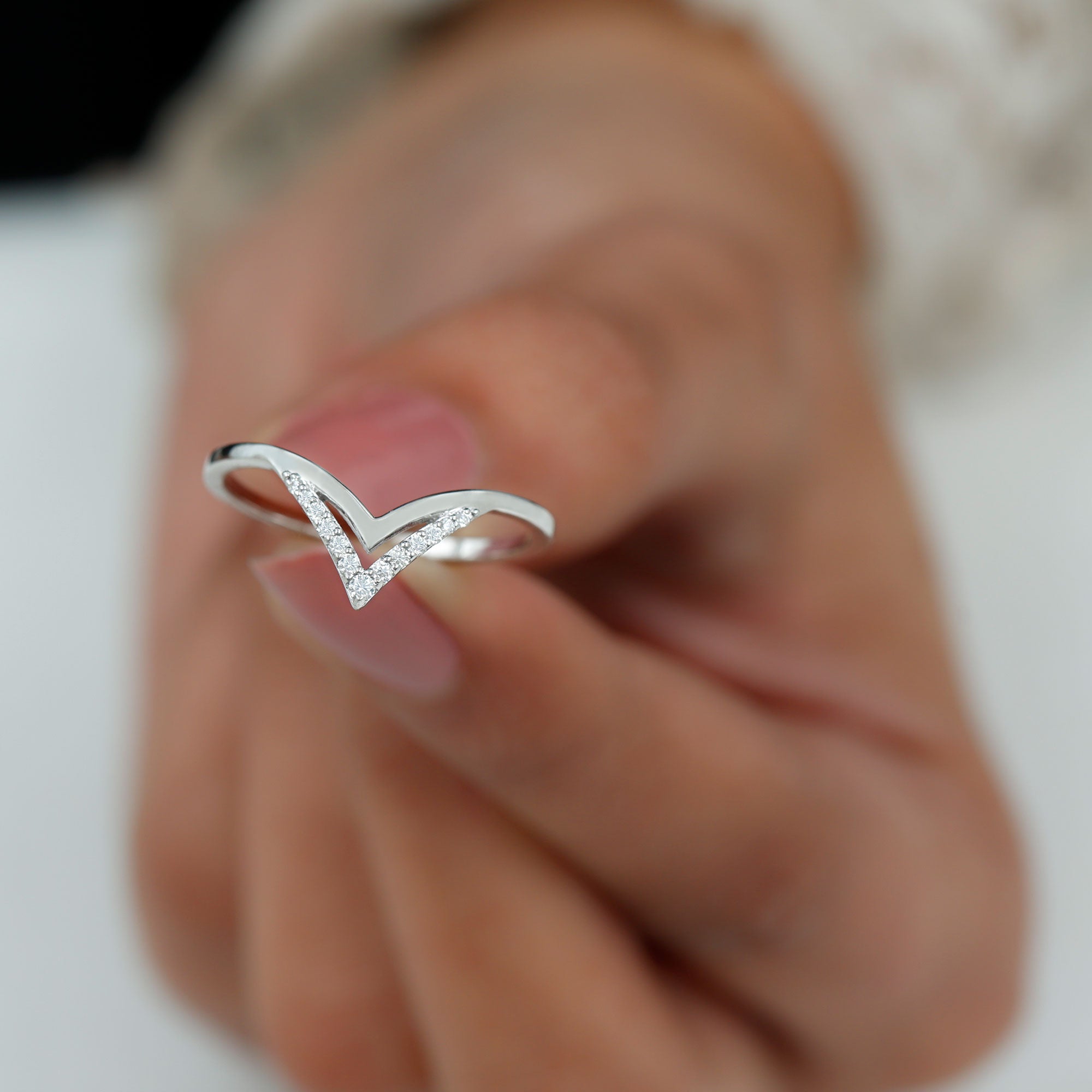Meet your new favorite go-to piece: our Moissanite Stackable Ring. Crafted in high quality metal and shaped into a sleek V silhouette, this ring is equal parts chic and timeless. Whether you are stacking it with your everyday favorites or letting it shine solo, this piece brings an effortlessly modern twist to your jewelry game.Let’s talk about the sparkle - because this Chevron Ring delivers that perfectly. Lined with radiant, round cut moissanite stones, it brings just the right amount of glimmer to catch the light (and compliments). Moissanite is known for its brilliance and fire, and honestly, it gives diamonds serious competition for their money, plus, it is a more sustainable, budget-friendly choice.The double-chevron design adds depth and dimension, making it a standout piece even when worn alone. This V Shaped Wedding Band curves delicately around your finger, flattering every hand and adding a polished edge to your look without being over the top.Perfect as a wedding band alternative, part of a stylish ring stack, or even as a gift to yourself (because you deserve nice things!), this Ring Guard is as versatile as it is beautiful. Whether you are dressing up for a night out or keeping it low-key in jeans and a tee, this ring fits right in.Polished, elegant, and full of personality - just like you. The Moissanite Enhancer Ring is more than jewelry, it is a little dailydose of confidence.